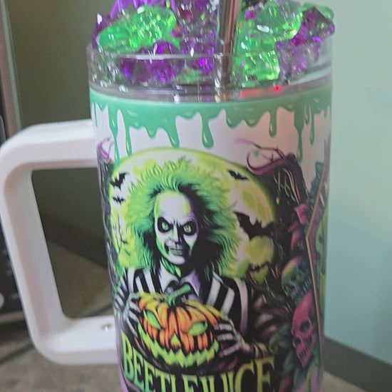 The Topper Is Made With Faux Colored Ice And Has Decorative Charms And A Led Light That Lights Up The Ice. It Comes With An Extra Stanley Style Lid,Metal Straw, Brush Cleaner And A Extra Battery.